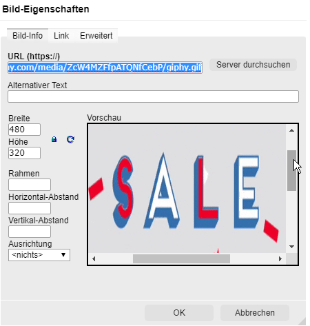 4) Jetzt müssen Sie nur noch die URL des von Ihnen gewähltem GIF kopieren und einfügen und im URL-Bereich die URL des von Ihnen selektiertem GIF kopieren.